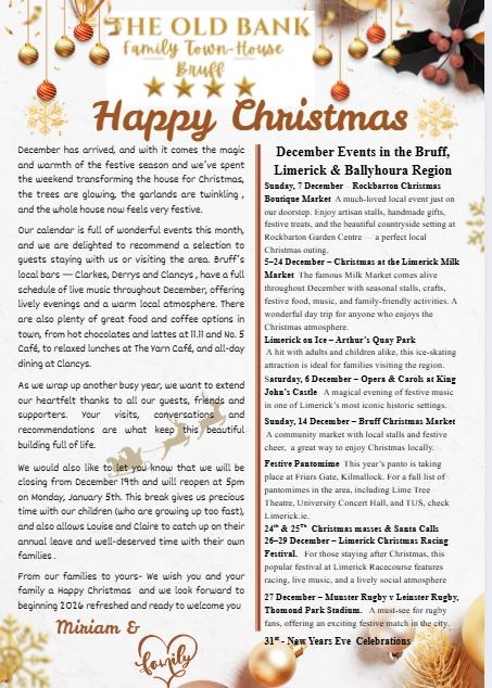 We spent the weekend transforming the house for Christmas, and it’s now glowing with trees, garlands and plenty of seasonal warmth. Our December newsletter is now ready, filled with local events, Christmas markets, festive outings and everything happening around Bruff and the wider Limerick and Ballyhoura region. From family activities to live music, pantomimes and winter markets, there’s so much to enjoy in the weeks ahead.
